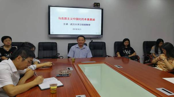 2018年9月21日,教育部“长江学者”特聘教授、武汉大学哲学院博士生导师汪信砚教授应邀来ok138cn太阳集团讲学,ok138cn太阳集团院长高其荣教授主持了讲座,ok138cn太阳集团党总支书记喻义东教授、部分教师和我校思想政治教育专业硕士研究生参加了讲座。