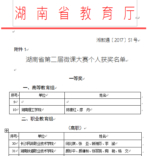 近日,根据湖南省教育厅《关于湖南省第二届微课大赛获奖结果的通报》文件(湘教通[2017]51号),我院陈素红老师在湖南省第二届微课大赛中获得一等奖。