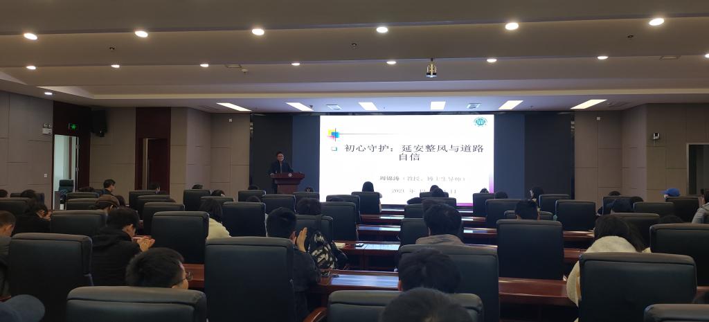 周锦涛教授主要从延安整风与道路自信这两个方面进行了阐释。延安整风运动是第一次全党范围内的马克思主义的思想教育运动,开创了党内集中教育活动的先河。通过开展整风运动,实现了以毛泽东同志为核心的全党新的团结与统一,为抗日战争的胜利以及新民主主义革命在全国范围内的胜利奠定了重要的思想政治基础。道路自信底气来自于初心使命,初心和使命是我们党的立党之魂,是激励一代代中国共产党人前赴后继、英勇奋斗的根本动力,而党史学习则是保证我们党永葆初心使命的有效途径。纵观党的百年发展史,从革命、建设到改革开放新时期,我们党每每面临新的重大形势和任务时,都会及时召开全党集中的党史学习活动,达到统一思想、凝聚共识、保持先进性、提高战斗力,这已经成为我们党保持执政长久稳定的优良传统和重要经验。而延安整风运动是保持党的初心的典型。