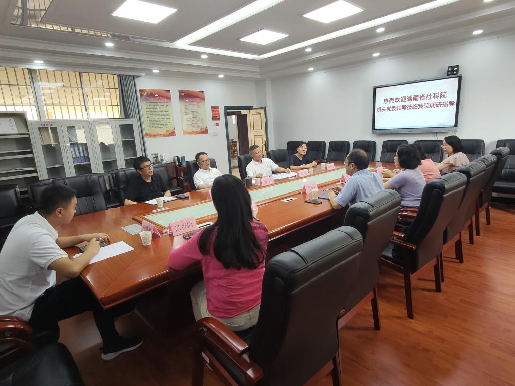 6月8日上午,湖南省社会科学院机关党委常务副书记王安中研究员、机关纪委书记周丽副研究员一行7人来我院调研。学院院长鲁涛,副院长刘小华、杜艳艳参加调研座谈。学院党委书记黄剑主持座谈会。