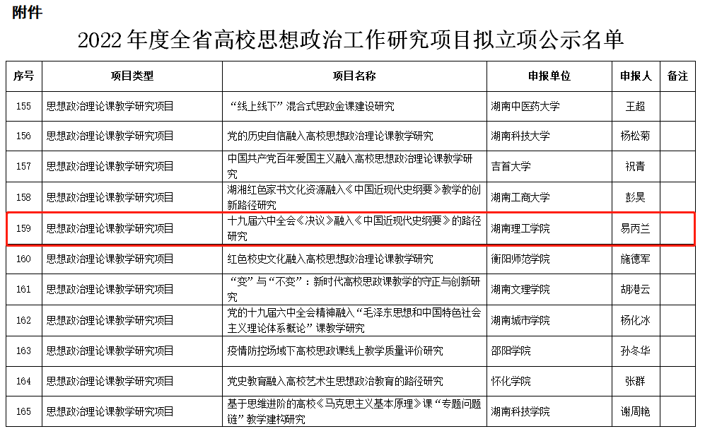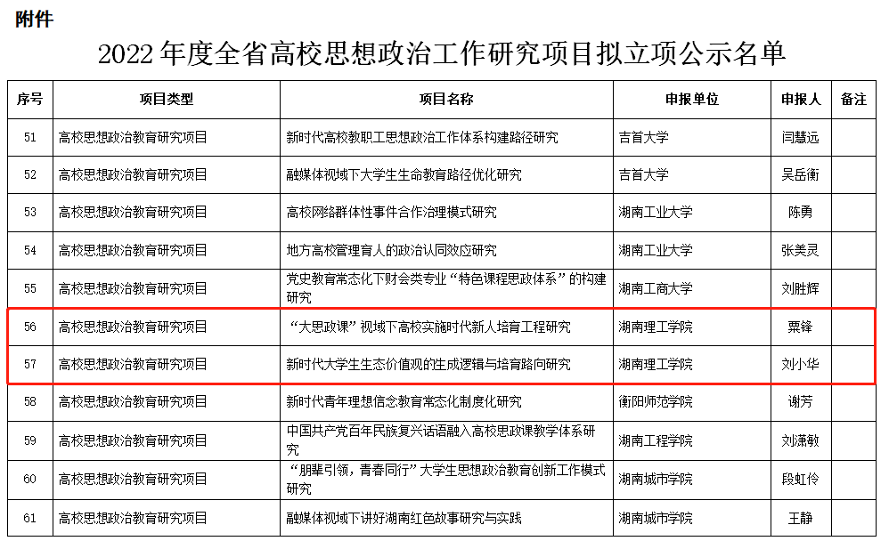 近日,湖南省教育厅发布《关于2022年度全省高校思想政治工作研究项目评选结果的公示》,我院教师刘小华副教授的《 新时代大学生生态价值观的生成逻辑与培育路向研究》和粟锋博士《“大思政课”视域下高校实施时代新人培育工程研究》获得高校思想政治教育研究项目立项,易丙兰博士的《十九届六中全会<决议>融入<中国近现代史纲要>的路径研究》获得思想政治理论课教学研究项目立项,我院本年度推荐的高校思想政治工作研究项目全部获批,立项率为100%。