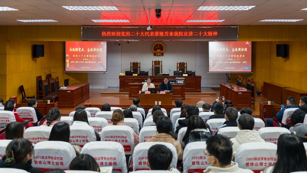 12月6日下午,党的二十大代表、岳阳市委宣讲团成员、岳阳县润升水稻专业合作社、丰润农机专业合作社理事长董敏芳女士在南院8号教学楼模拟法庭作党的二十大精神宣讲报告会。我院全体教师、入党积极分子及学生干部代表参会。会议由学院副院长郑立新主持。