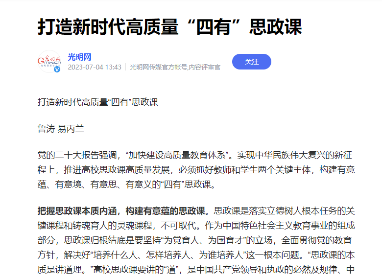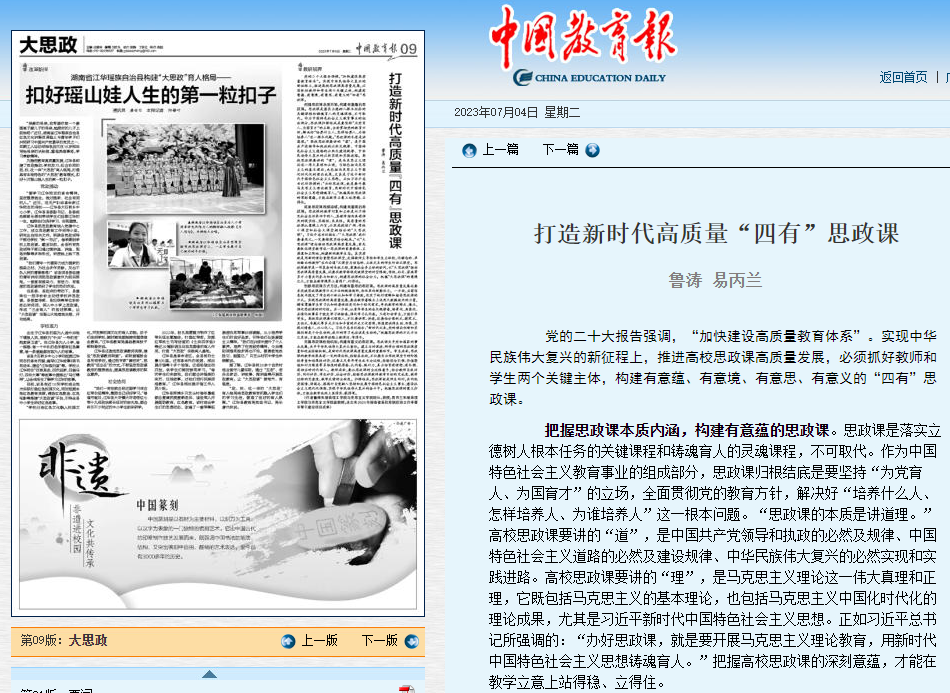 7月4日,《中国教育报》“大思政”(第09版)刊发我院院长鲁涛教授和青年博士易丙兰副教授联合署名文章《打造新时代高质量“四有”思政课》。该文结合习近平总书记关于思政课建设的重要论述、关于“大思政课”建设的重要指示,提出“必须抓好教师和学生两个关键主体,构建四有‘思政课’”:把握思政课本质内涵,构建有意蕴的思政课;拓宽思政课视域场域,构建有意境的思政课;创新思政课方式方法,构建有意思的思政课;完善思政课检验机制,构建有意义的思政课。