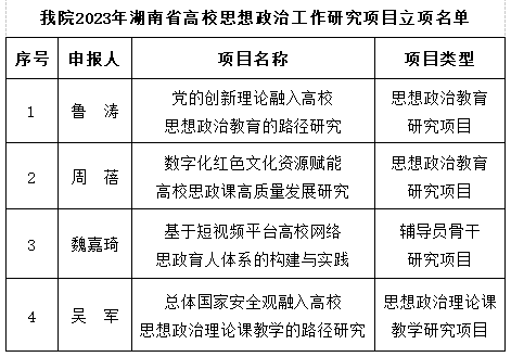 近日,湖南省教育厅发布《关于2023年度湖南省高校思想政治工作研究项目评选结果的公示》,我院有4项课题喜获立项,其中思想政治教育研究项目2项,辅导员骨干研究项目1项,思想政治理论课教学研究项目1项。