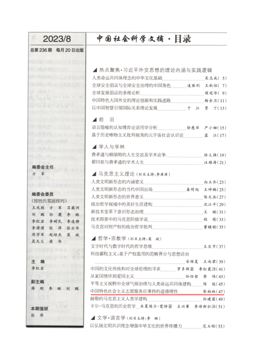 近日,湖南省高校优秀思想政治工作者“名师工作室”负责人、我院二级教授彭柏林发表在《武汉大学学报(哲学社会科学版)》2023年第1期的《中国特色社会主义志愿服务应秉持的道德理性》一文产生了良好的社会反响,先后被《中国社会科学文摘》2023年第8期、人大复印报刊《伦理学》2023年第5期全文转载。