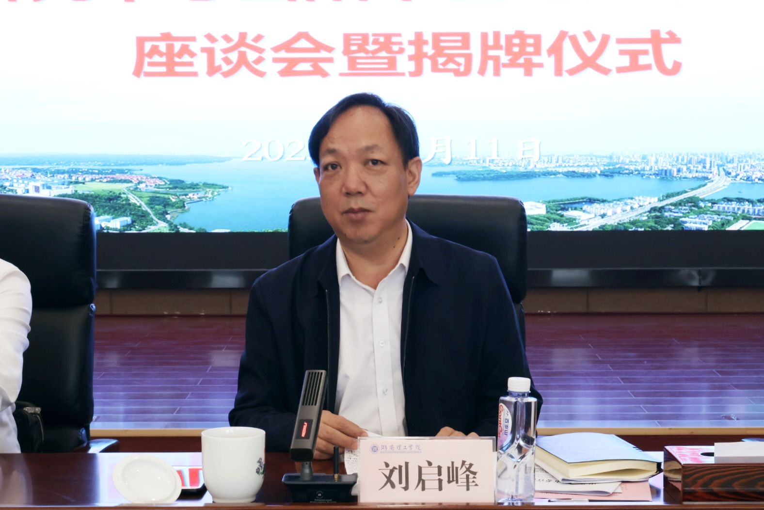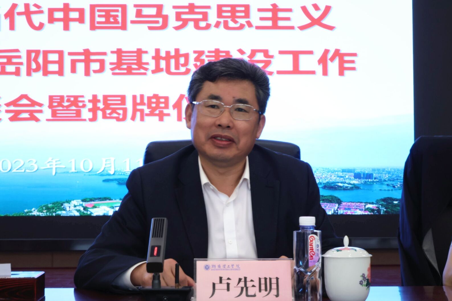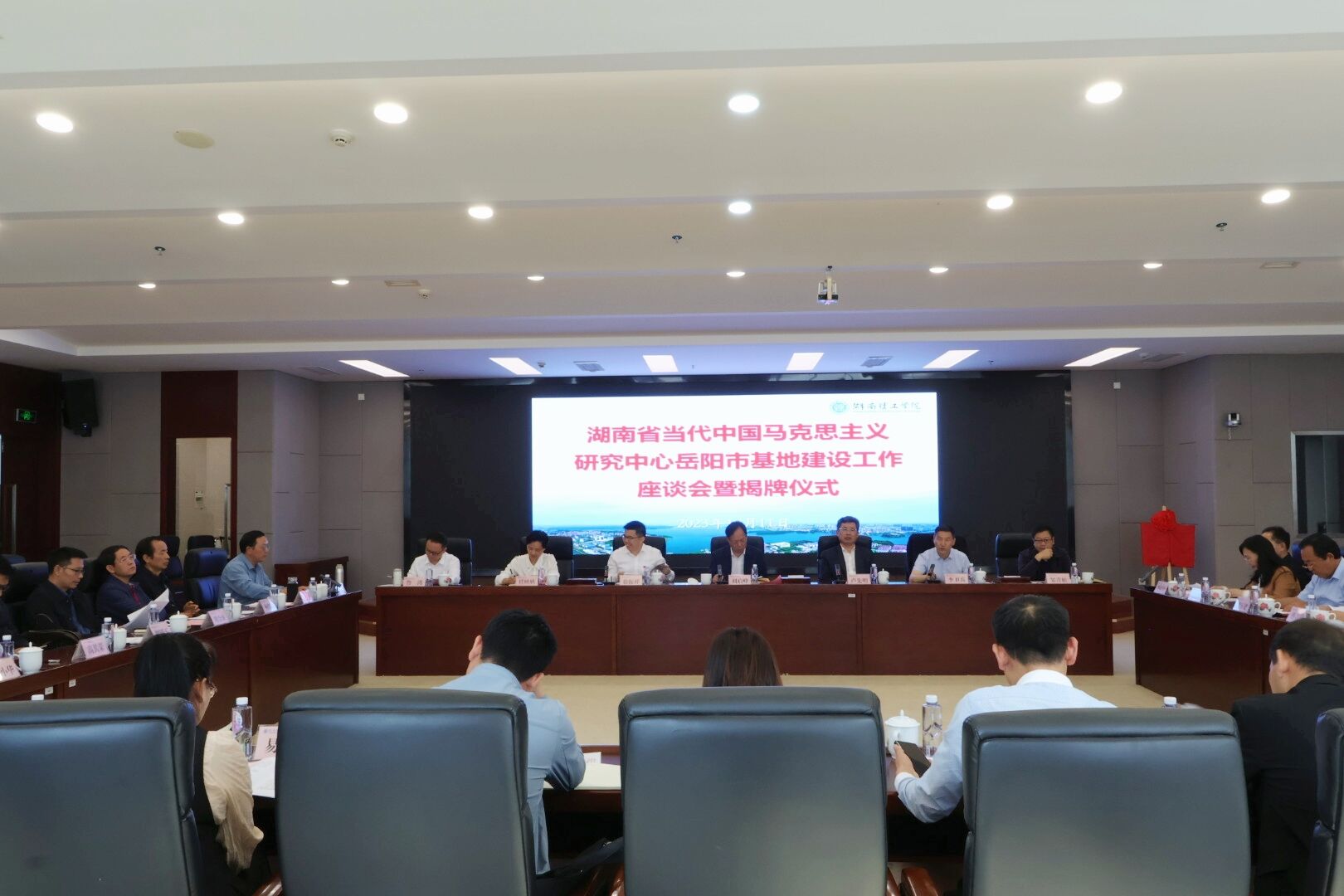 10月11日,湖南省当代中国马克思主义研究中心岳阳市基地建设工作座谈会暨揭牌仪式在学校图书馆11楼会议厅举行,岳阳市委常委、市委宣传部部长刘启峰出席并讲话,学校党委书记卢先明致辞。仪式由学校党委委员、副校长徐振祥主持。来自市委宣传部、市委政研室、市直机关工委、市政府研究室、市政协经科委、市委党校、市社科联、君山区委宣传部、学校各相关学院和岳阳开放大学等单位的领导和社科专家共40余人参加揭牌仪式。