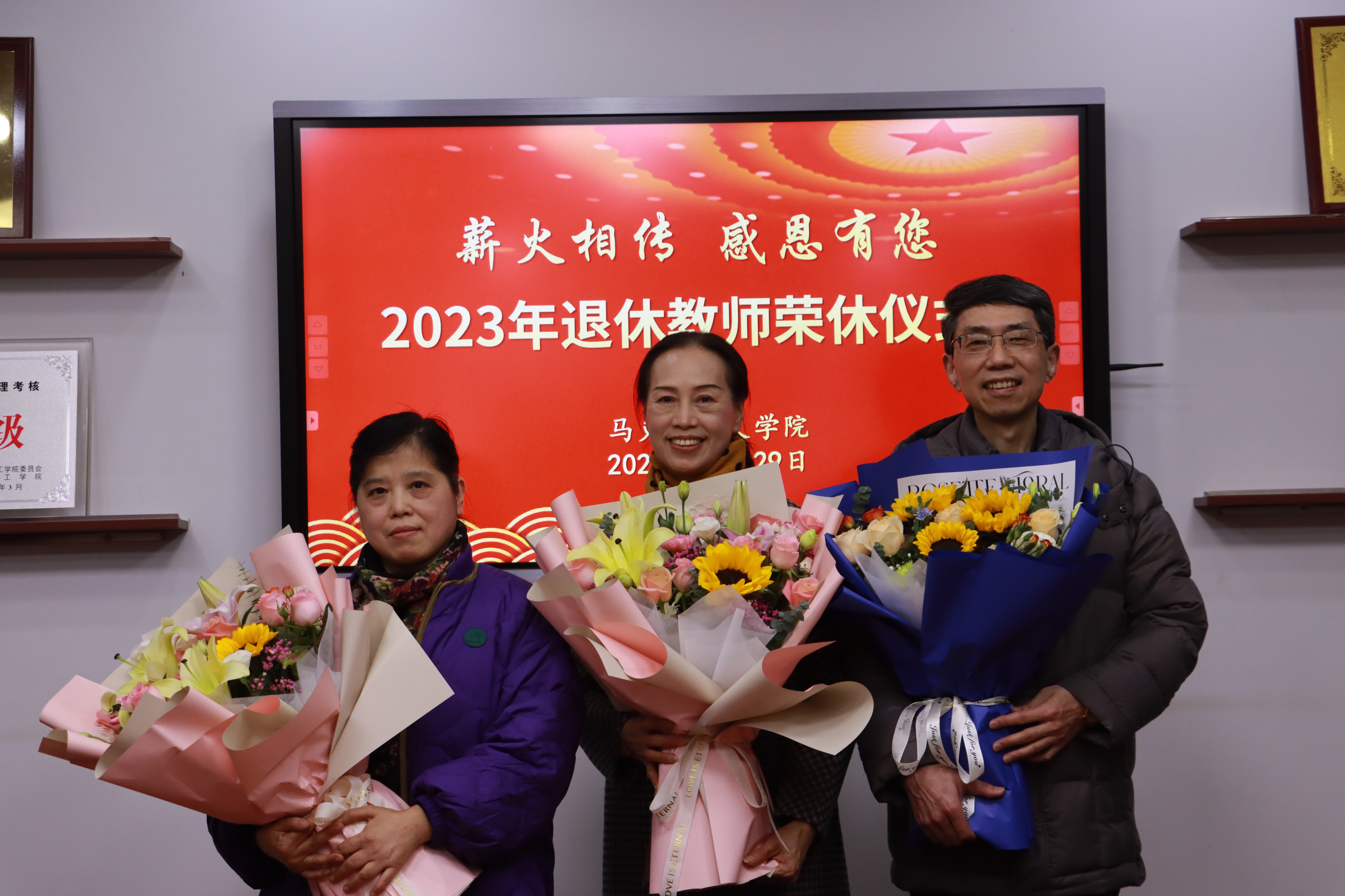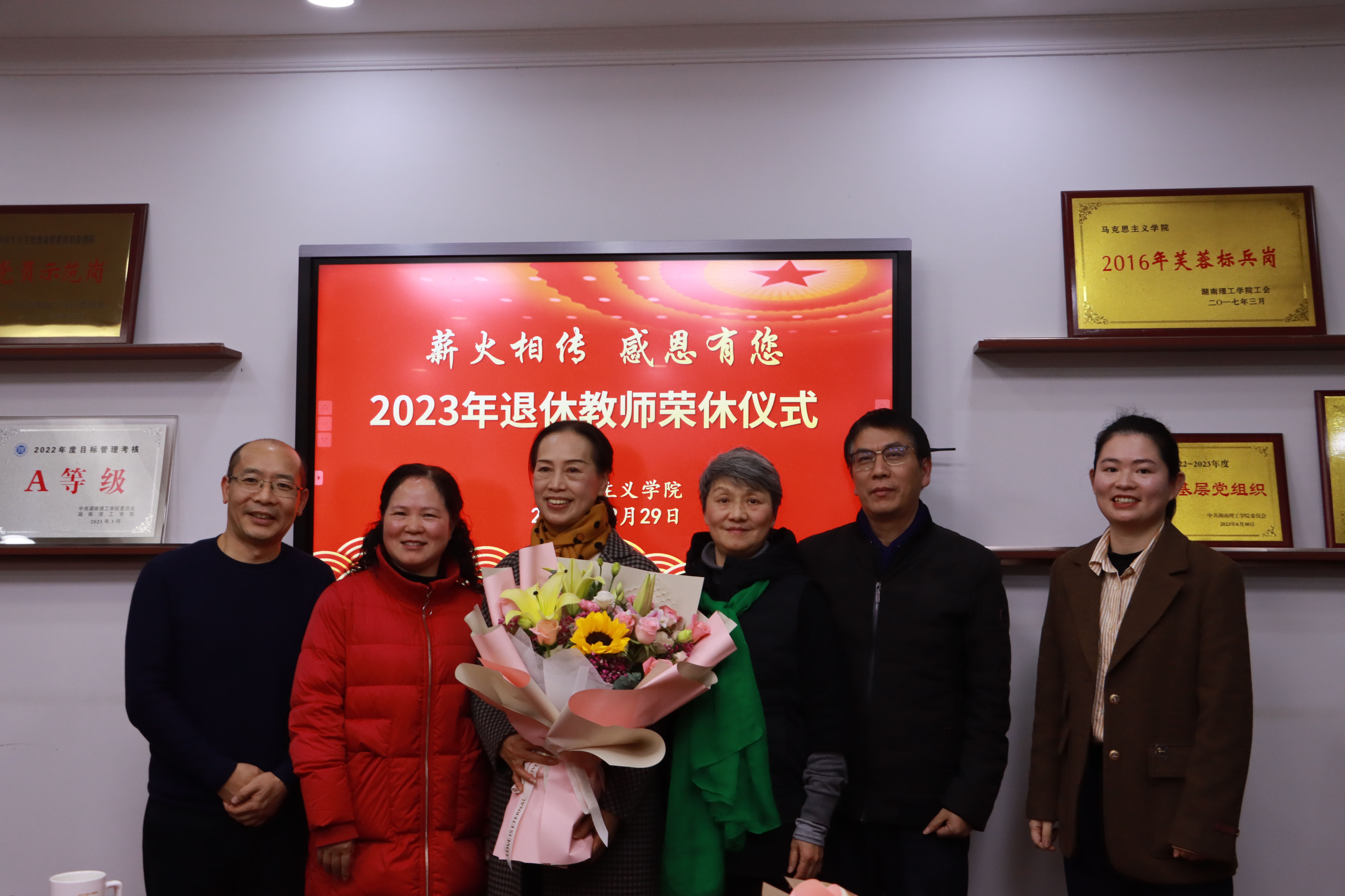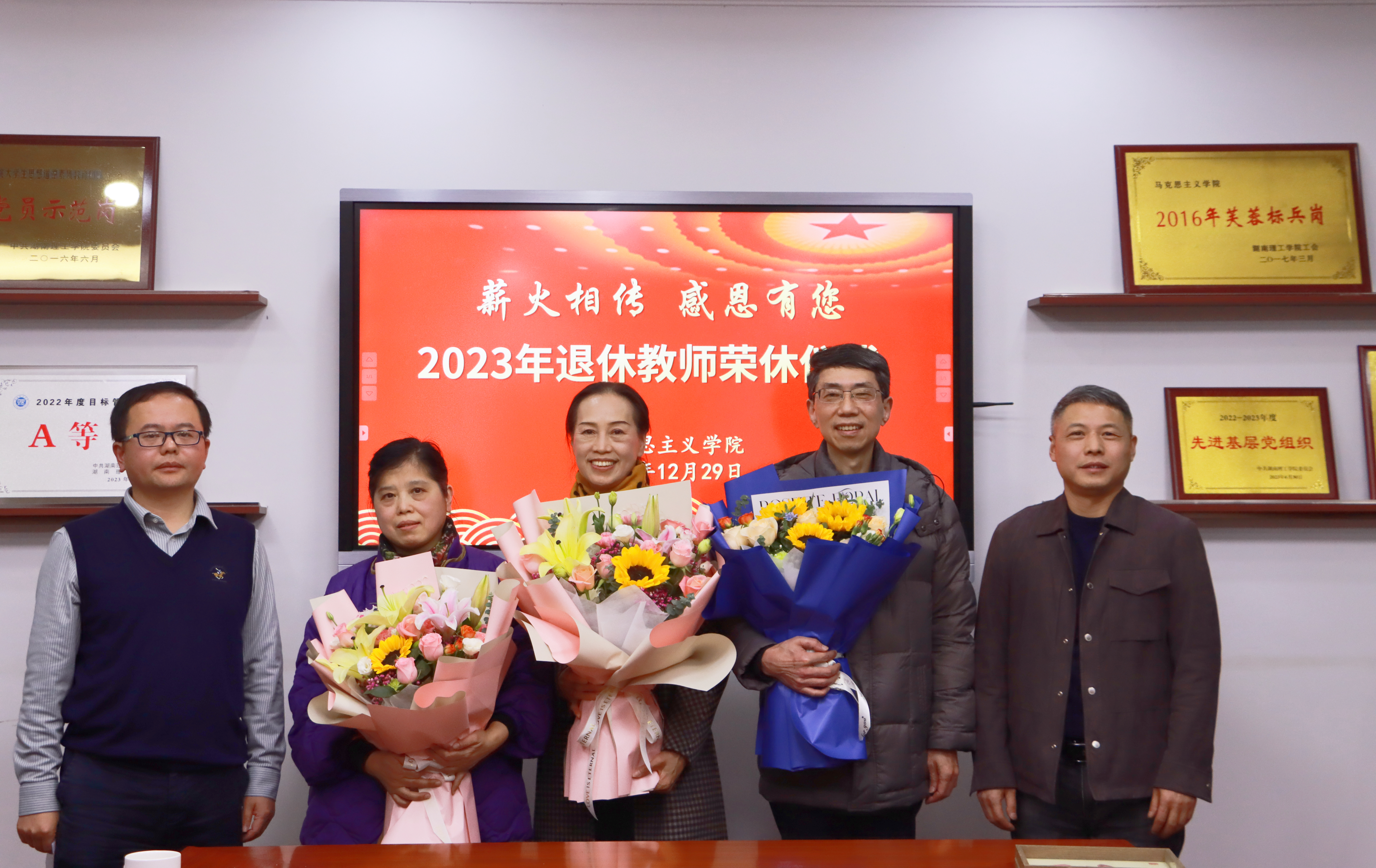 12月29日下午,“薪火相传 感恩有您”,学院为李大健、范虹、陈其胜、匡促联四位教授举行2023年度退休教师荣休仪式。学校党委宣传部常务副部长、教师工作部部长王庆华出席,学院党政班子成员,分工会委员、部分教研室主任和青年博士代表参加。仪式由学院党委书记黄剑主持。