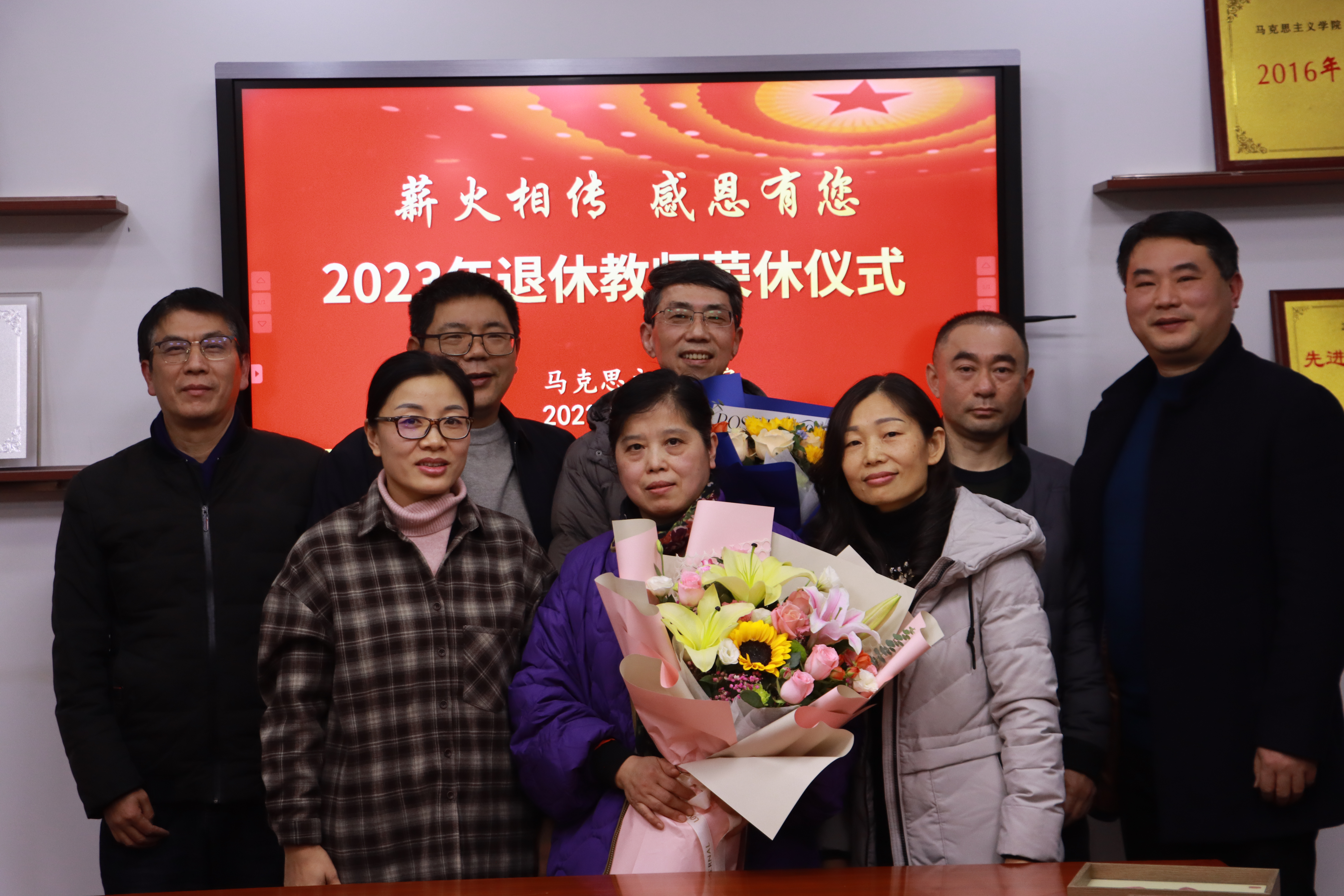 仪式最后,王庆华、鲁涛为荣休教师送上了鲜花、纪念品和慰问金。与会教师纷纷和退休教师合影留念。