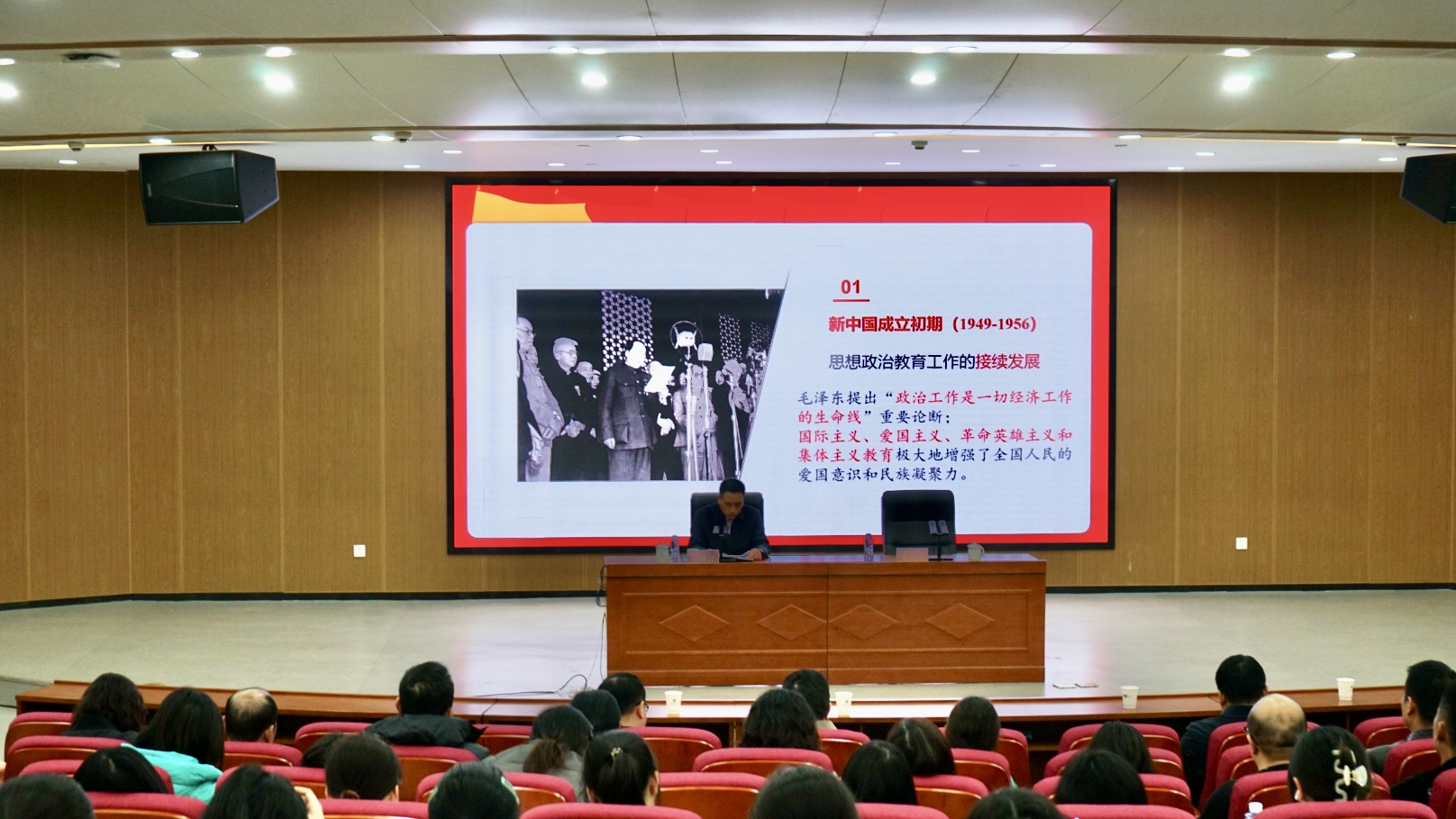 张国云围绕“做好新时代高校思想政治教育工作”展开讲课。张国云指出,思想政治教育是中国共产党优良的工作传统、鲜明的政治优势。他详尽讲述了中国共产党思想政治教育工作的发展进程。张国云提出,党的十八大以来,习近平总书记关于思政课建设多次发表重要讲话、作出重要指示,极大地丰富和发展了党的思想政治教育工作的内涵,对推动高校思政课程建设具有重要意义。张国云以新时代课程思政的概念的提出、内涵和特点为基础,针对当前和今后一个时期如何进一步加强学校的思政课建设提出了三点应对策略:一是打造一支高素质的课程思政教师队伍;二是完善学校的思想政治教育体系;三是以点带面逐步开展有特色的课程思政。