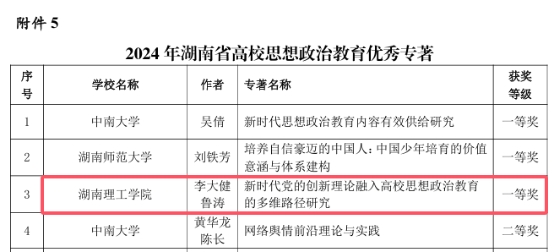 经各高校自行申报、研究会各分支机构推荐、专家组评审,全省共评选出“先进个人”92人,优秀论文60篇,优秀专著18部,优秀案例50个。其中,我院院长鲁涛教授获评“2024年湖南省高校思想政治教育研究先进个人”,李大健教授、鲁涛教授出版的著作《新时代党的创新理论融入高校思想政治教育的多维路径研究》获优秀专著一等奖,粟锋副教授撰写的论文《高校“大思政课”培育时代新人的逻辑、价值与策略》获优秀论文二等奖。