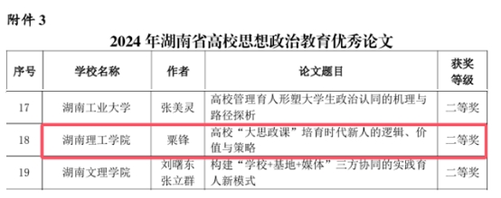 近日,湖南省高校思想政治教育研究会公布《关于表彰2024年湖南省高校思想政治教育研究先进单位、先进个人,优秀论文、优秀案例、优秀专著的通报》,学校获评“2024年湖南省高校思想政治教育研究先进单位”,我院教师喜获多项荣誉。