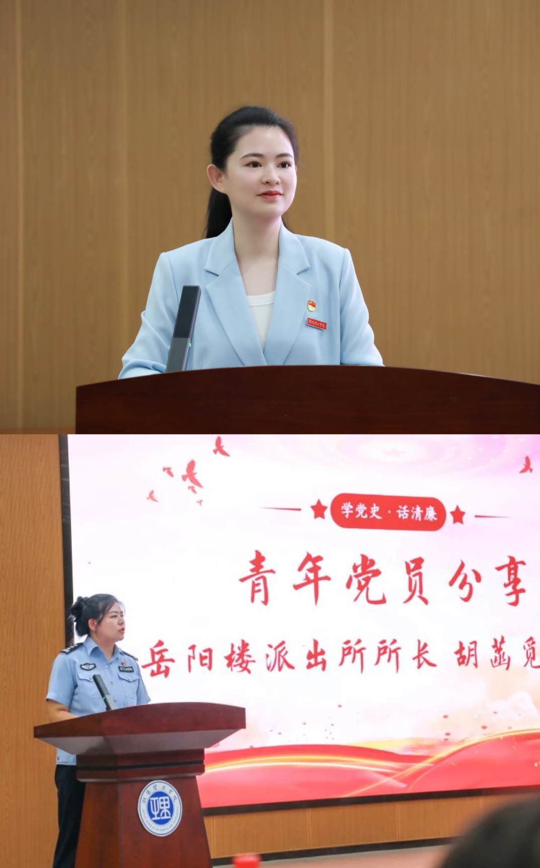 活动中,岳阳楼派出所所长胡菡觅用三组词语分享担当“红色传承,守护平安”榜样力量的感悟。谈及使命与初心时,她认为中国共产党是一部血泪史、英雄史、奋斗史、教育史,如今新时代的“爱国三问”与长征路上的“长征三问”遥相呼应,既是对历史的铭记,也是对未来的叩问。我院青年教师、思想政治教育系主任周蓓从三个维度谈关于“信仰铸清廉,青春担使命”的感悟。她指出,党史是长恒的精神丰碑,其中任弼时同志的"骆驼精神"等清廉故事为当代党员树立了榜样。另外在红色育人实践方面,周蓓表示通过"行走的思政课"、场馆教学、红色实践等形式,结合馆地校协同、警校联合等创新举措,有效推动了廉政教育走深走实。