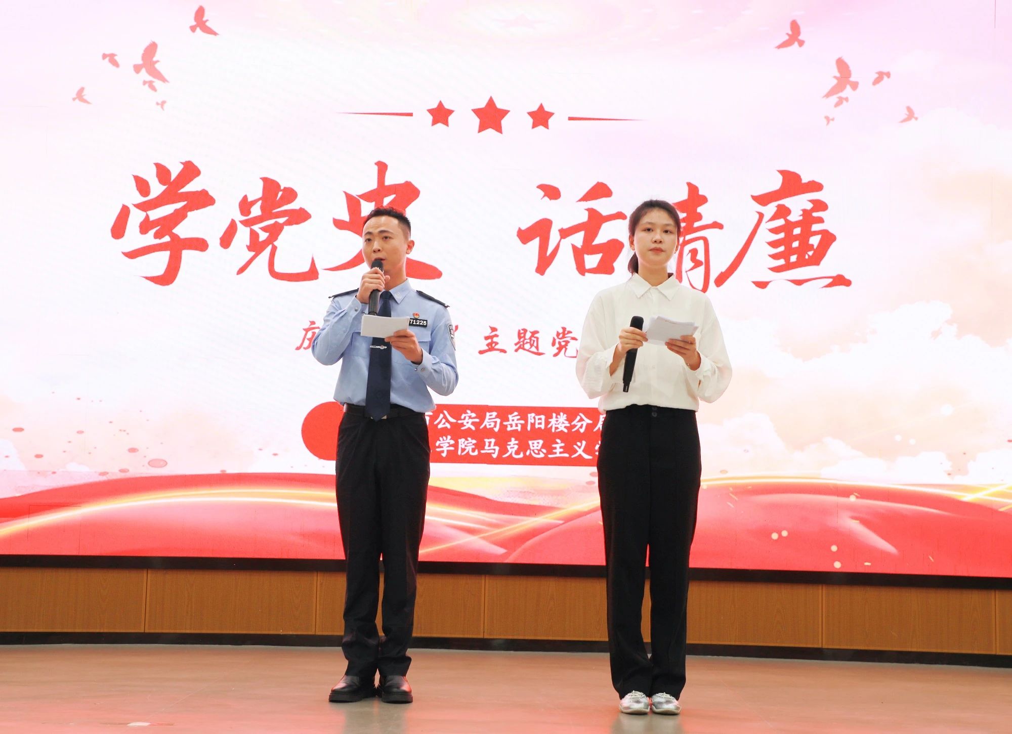 2025年6月25日下午,岳阳市公安局岳阳楼区分局牵手ok138cn太阳集团ok138cn太阳集团在17118会议室开展庆“七一”主题党日活动。本次活动由岳阳楼区副区长、公安分局党委书记、局长黎明,党委委员、政工室主任方教忠等民警代表和我院党委书记黄剑、副院长刘小华、副院长郑立新、副院长杜艳艳、党委副书记张晋超等老师、研究生和本科生共100名党员参加。经侦大队民警余以恒和我院学生干部李诗倪主持本次活动。