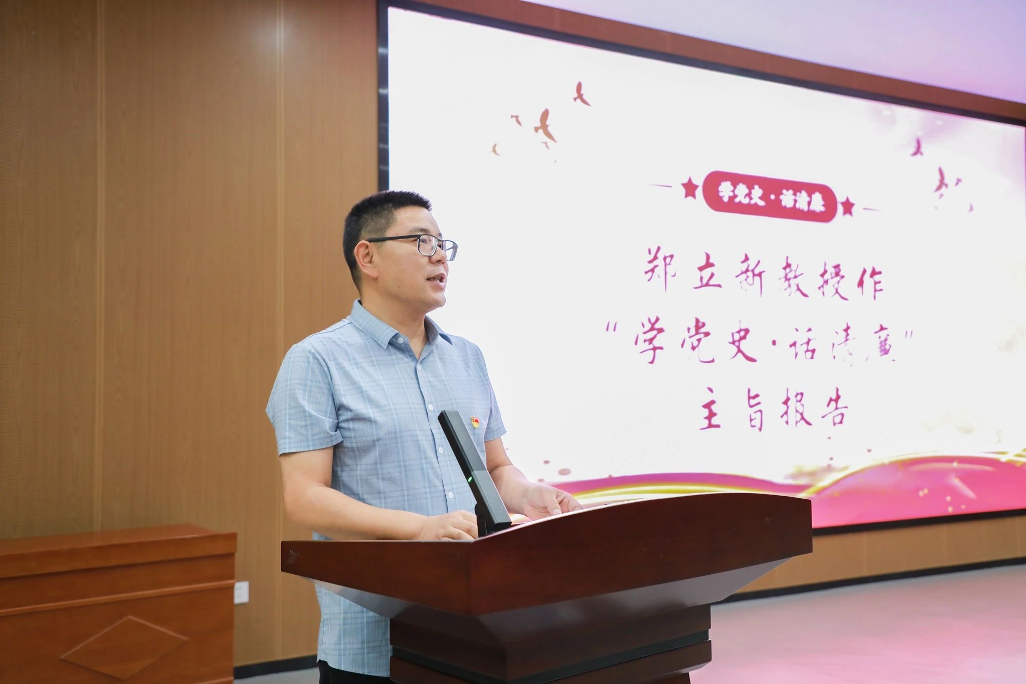 活动伊始,我院副院长郑立新作“学党史·话清廉”主旨报告,以深厚的理论功底和生动的党史案例,深刻阐述了中国共产党人的使命担当与廉政精神。他表示,站在新时代的历史节点回望党的百年征程,内心汹涌澎湃,深切感受到红色基因中蕴含的信仰力量与廉洁底色。