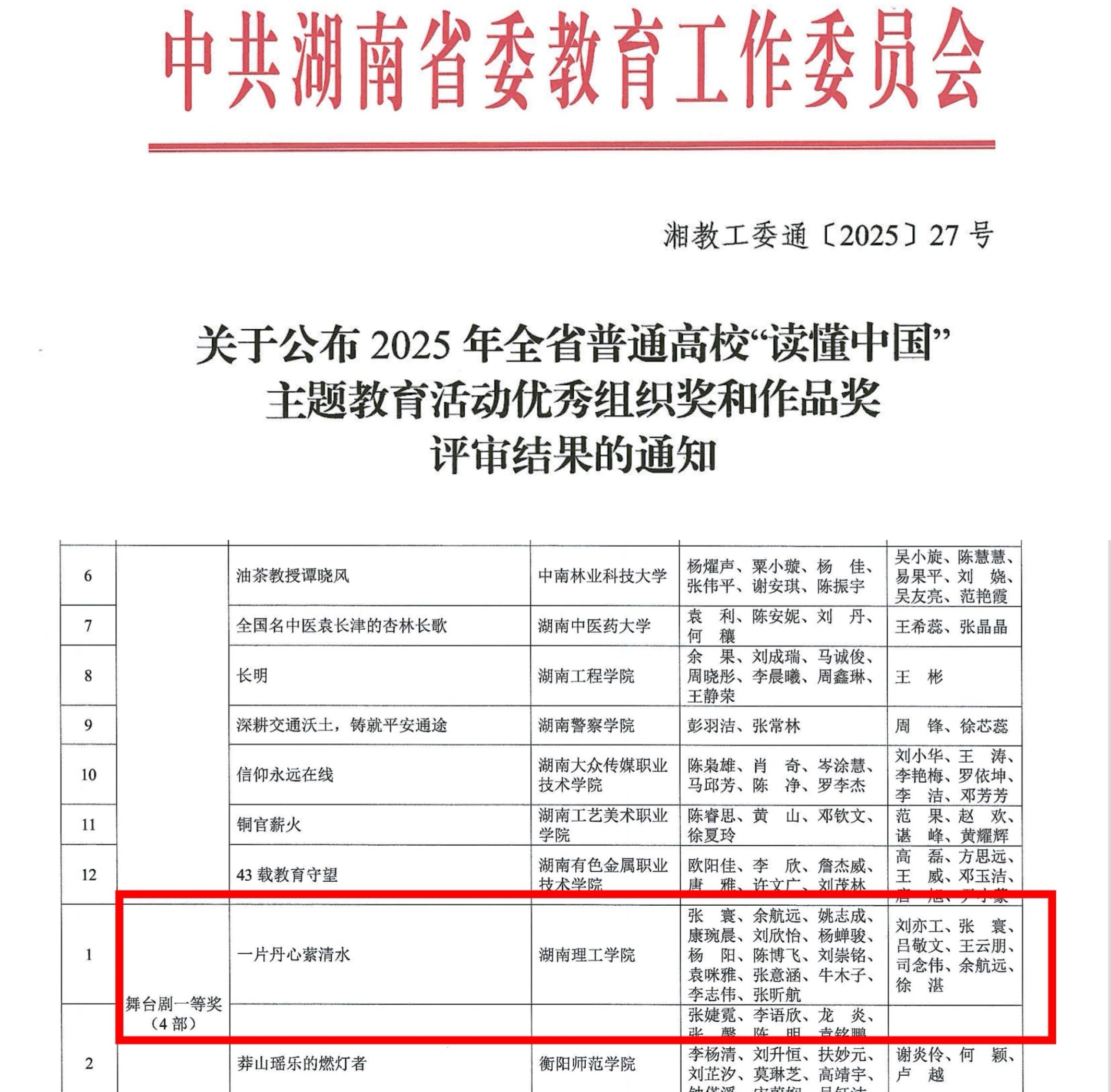 近日,2025年湖南省普通高校“读懂中国”主题教育活动评审结果揭晓,ok138cn太阳集团ok138cn太阳集团张寰老师指导、新青年红剧汇大学生话剧社团队倾情演绎的舞台剧《一片丹心萦清水》脱颖而出,荣膺省级一等奖。该剧以本校退休教授助力家乡产业与文化振兴的动人实践为蓝本,生动诠释“读懂中国”的深刻内涵,更成为ok138cn太阳集团以红色戏剧创新思政教育的典范之作。