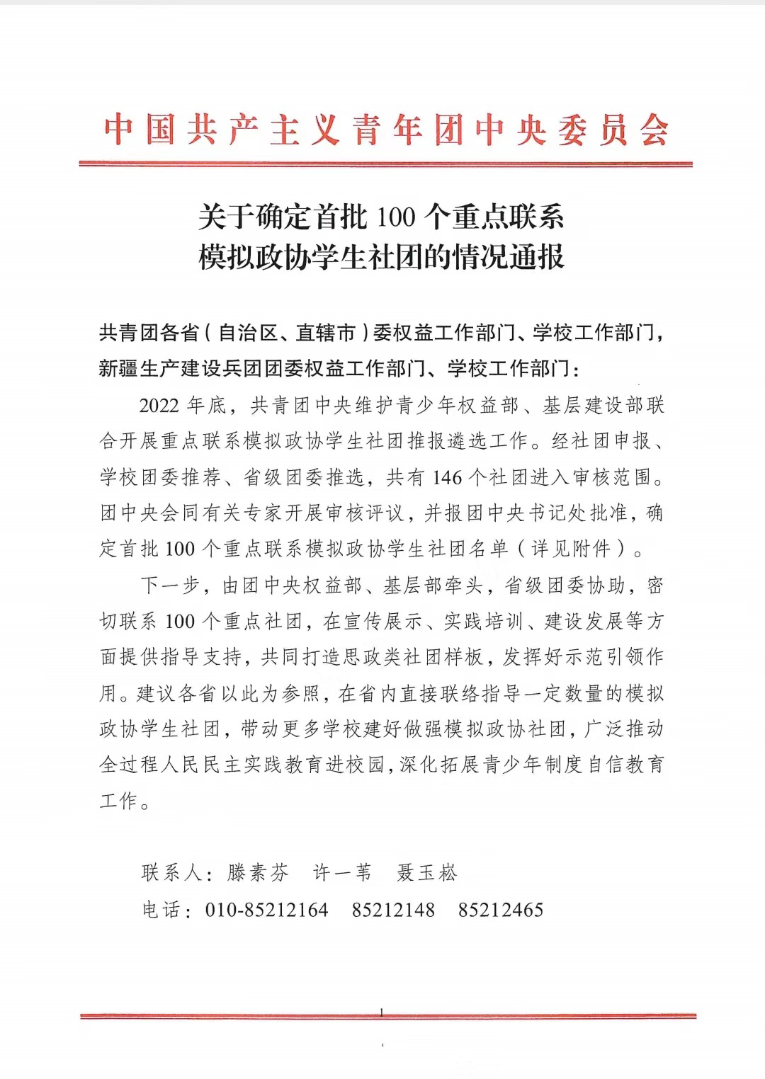 近日,共青团中央发布《关于确定首批100个重点联系模拟政协学生社团的情况通报》,确定全国首批100个重点联系模拟政协学生社团名单。我院“学生模拟政协协会”成功入选。