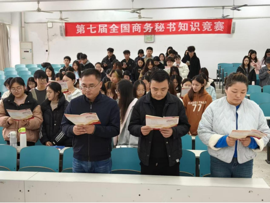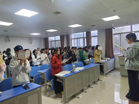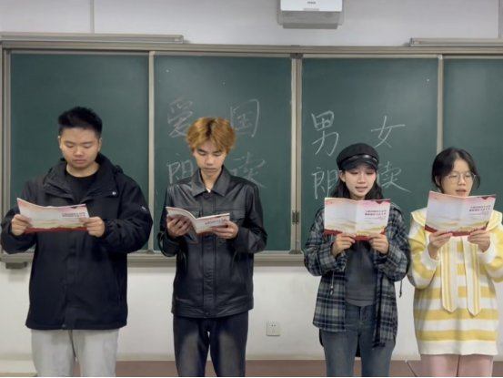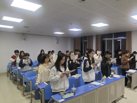 为深化对党的二十大精神的学习贯彻,学院还开展了课前领诵活动。活动期间的每日清晨与午后,学生自觉起立齐声朗诵,将爱国情感融入朗诵中,抒发对祖国的热爱。让这个简单而庄重的爱国仪式内化为一种爱国自觉,展现新时代青年对红色基因的坚守与传承。